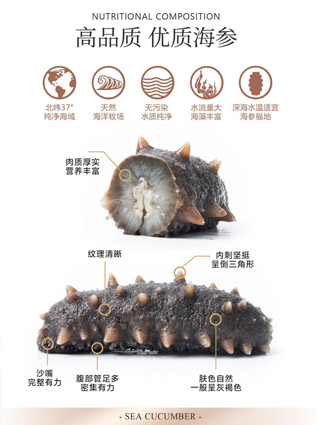 海參屬于無(wú)脊椎動(dòng)物、棘皮動(dòng)物門(mén)、海參綱。我國(guó)海參分布在溫帶區(qū)和熱帶區(qū),溫帶區(qū)主要在黃渤海域,主要經(jīng)濟(jì)品種是刺參,也是我國(guó)最為知名的海參種類,熱帶區(qū)主要在兩廣和海南沿海,主要經(jīng)濟(jì)品種有梅花參等。其中西沙群島、南沙群島和海南島是我國(guó)熱帶海參的主要產(chǎn)地。海參在各類山珍海味中位尊“八珍”,還具多種中醫(yī)特指的補(bǔ)益養(yǎng)生功能。近半個(gè)世紀(jì)以來(lái),國(guó)內(nèi)外學(xué)者對(duì)40多種海參化學(xué)成分的研究表明海參體內(nèi)不但富含氨基酸、維生素和化學(xué)元素等人體所需的50多種營(yíng)養(yǎng)成分,還含有多種生物活性物質(zhì)如酸性粘多糖、皂苷和膠原蛋白等,而且海參活性物質(zhì)的藥理活性十分廣泛。