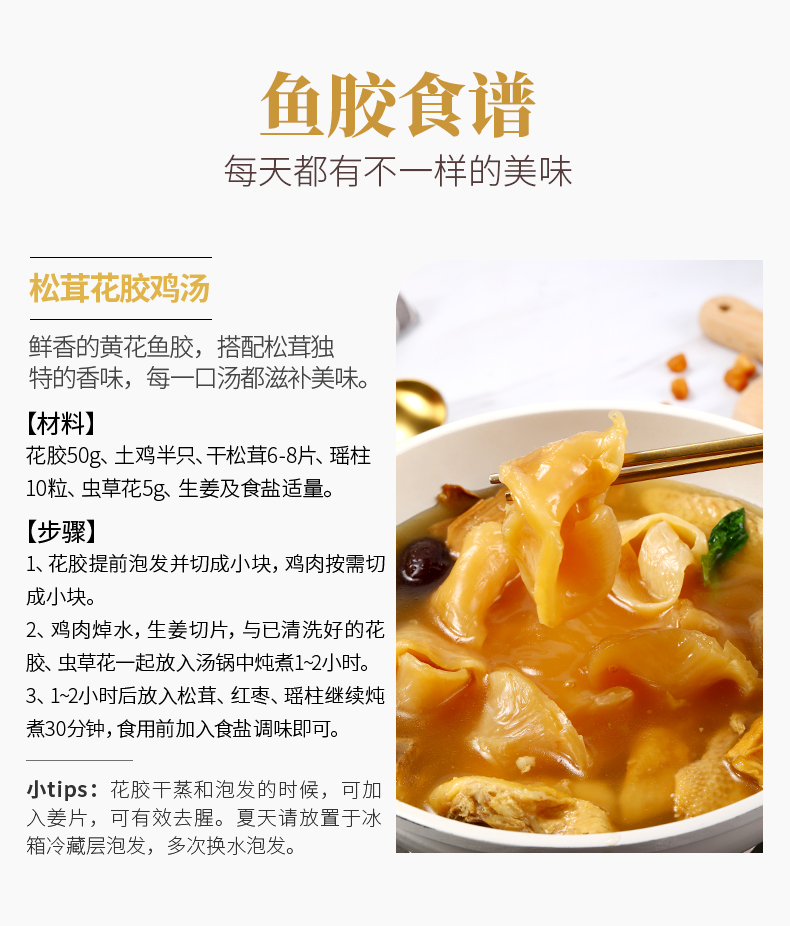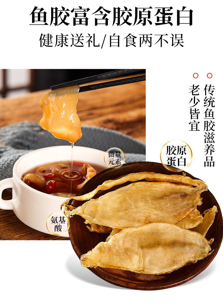 花膠即魚肚,是各類魚鰾的干制品,以富有膠質(zhì)而著名,故名為花膠?;z又名魚肚,是從魚腹中取出魚鰾,切開曬干后而成?;z含有豐富的蛋白質(zhì)、膠質(zhì)等,食療有滋陰養(yǎng)顏、固腎培精之效,可令人迅速消除疲勞。頂級魚肚排名依次是魚膠之王:金錢鳘魚膠、白花膠、黃鱘膠、黃花膠、鳘魚膠?;z不僅是筵席名菜,還有相當(dāng)?shù)淖萄a價值。
